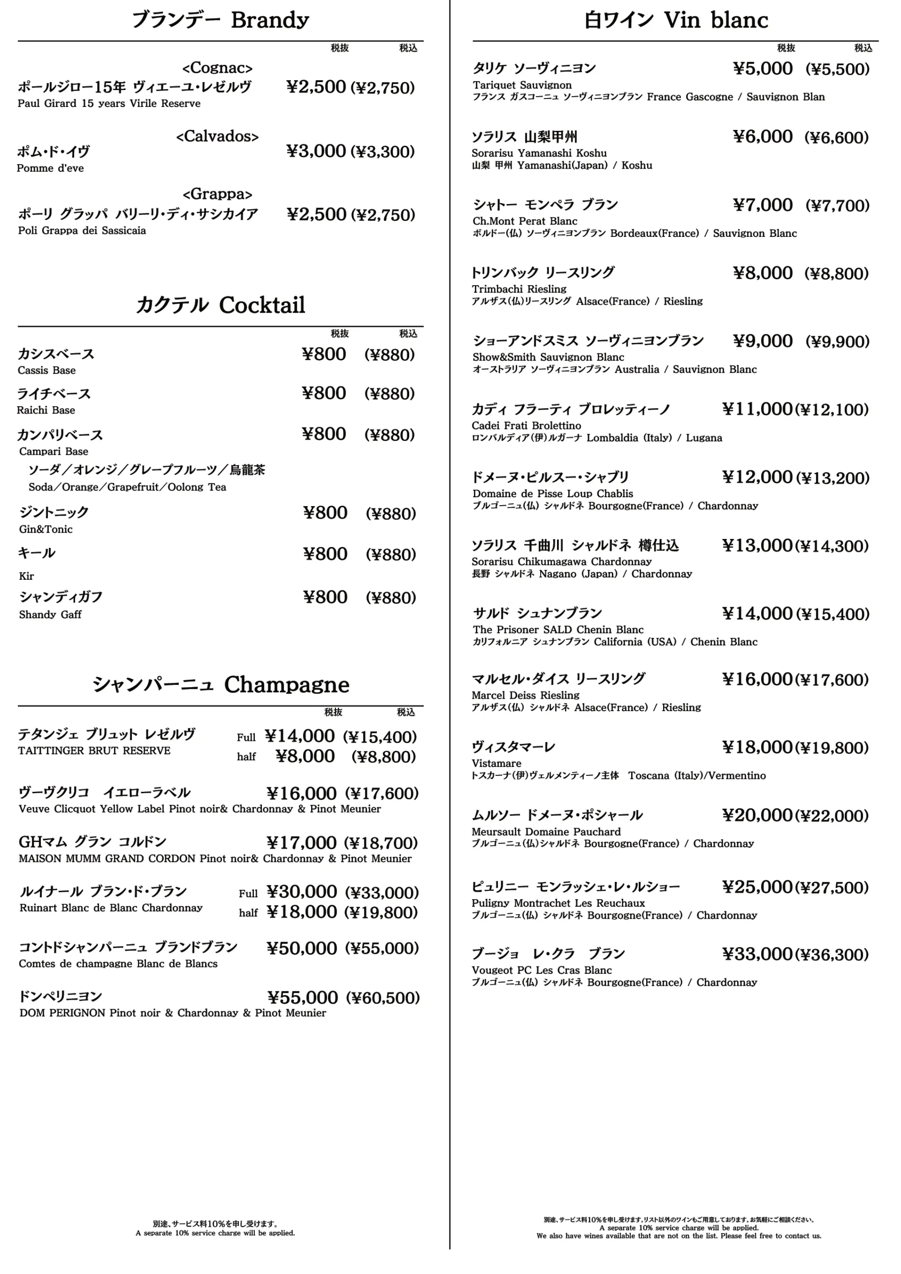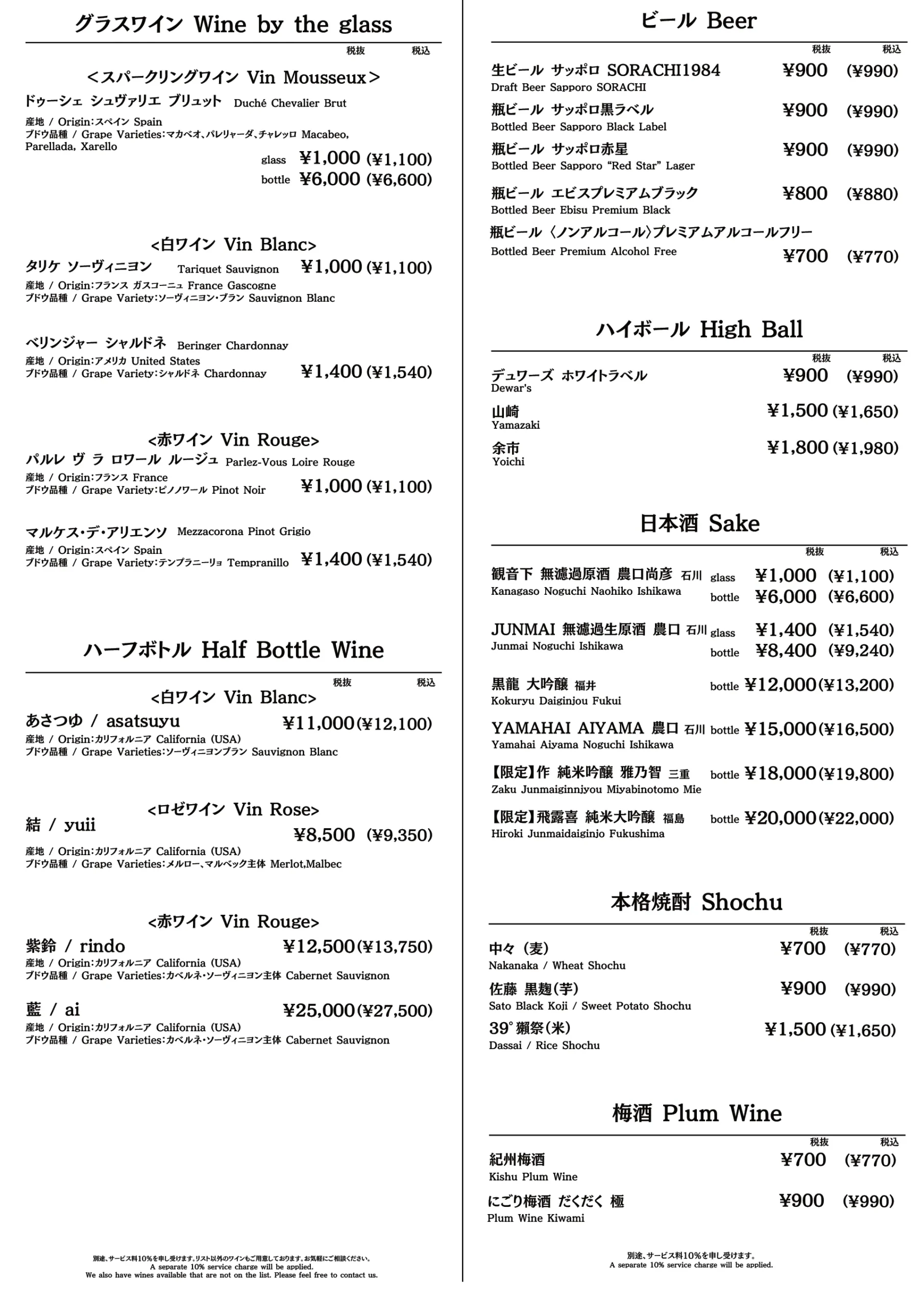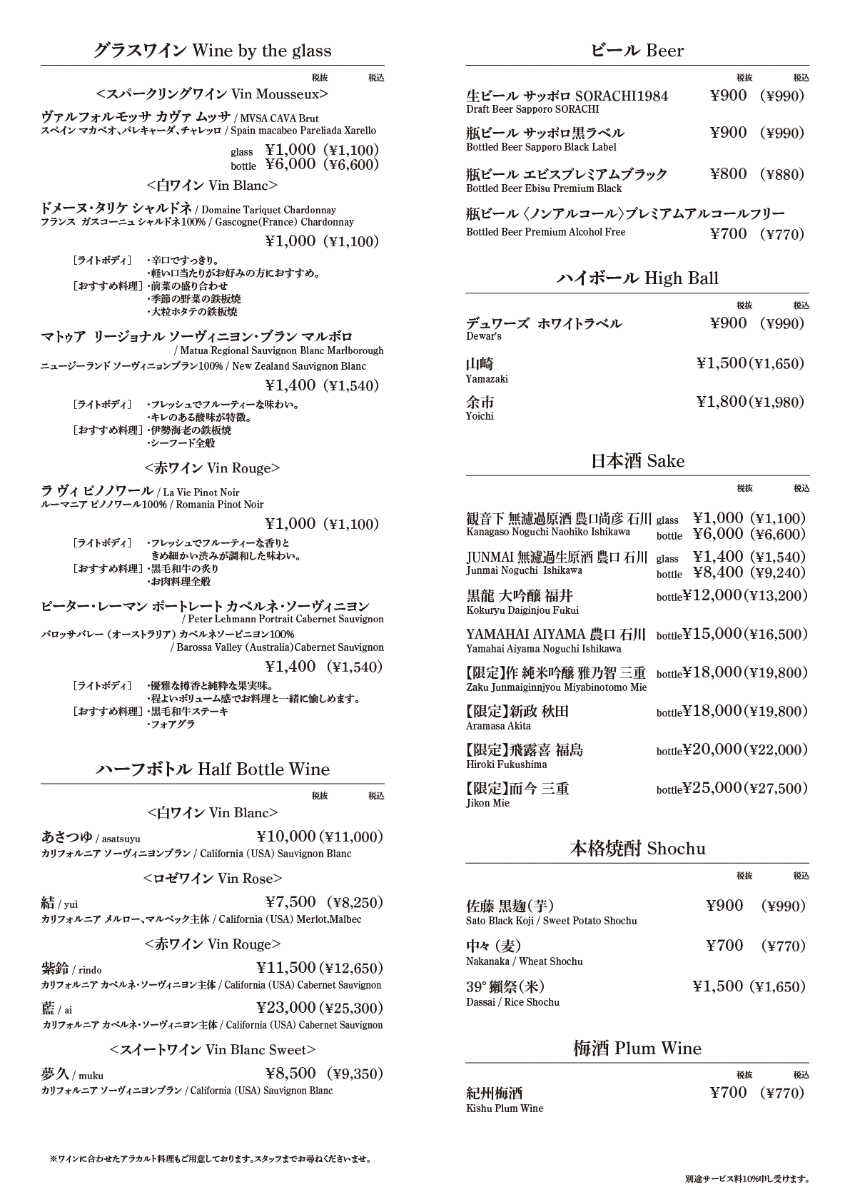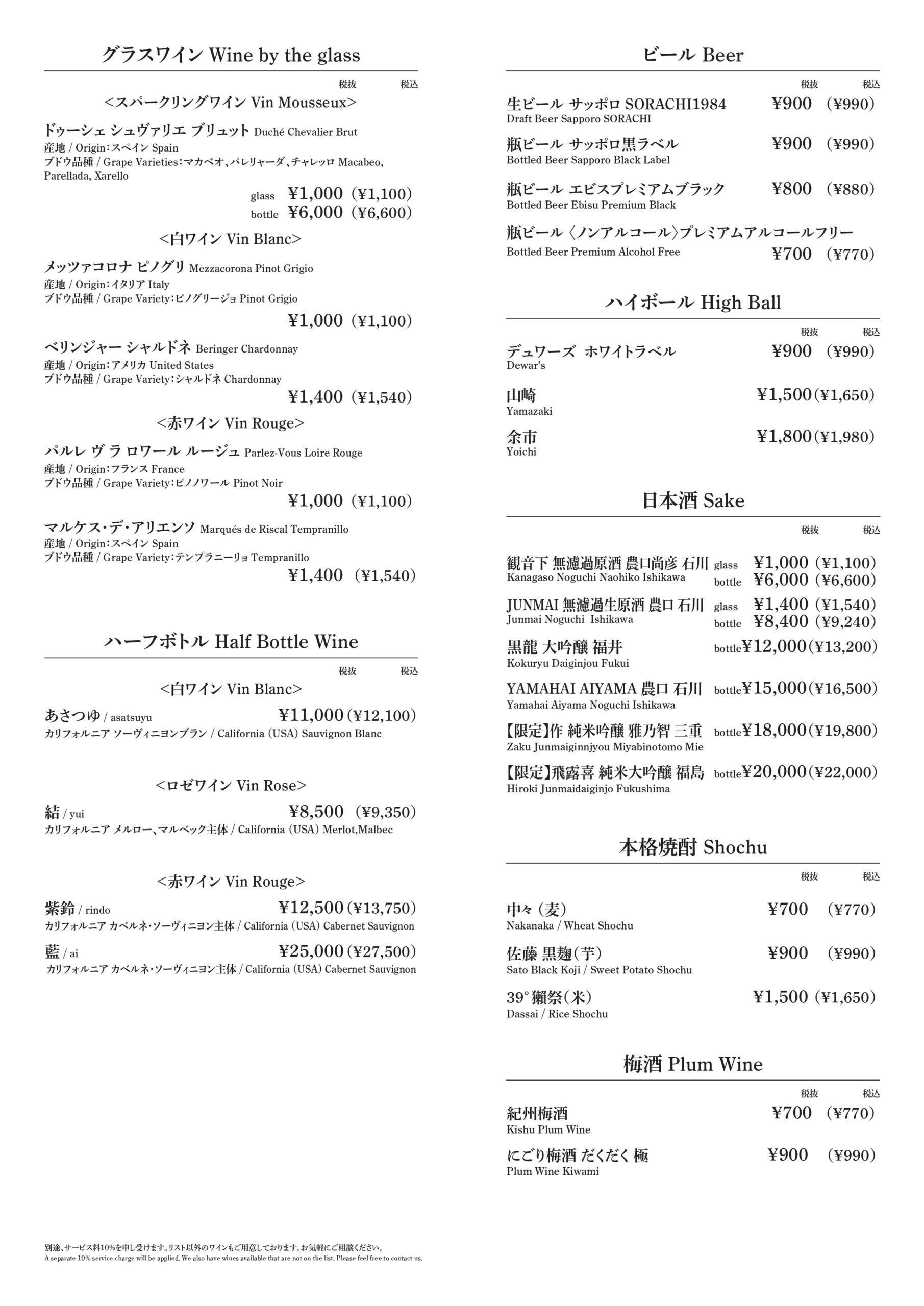 - Half Bottle 8,500円(税込9,350円)